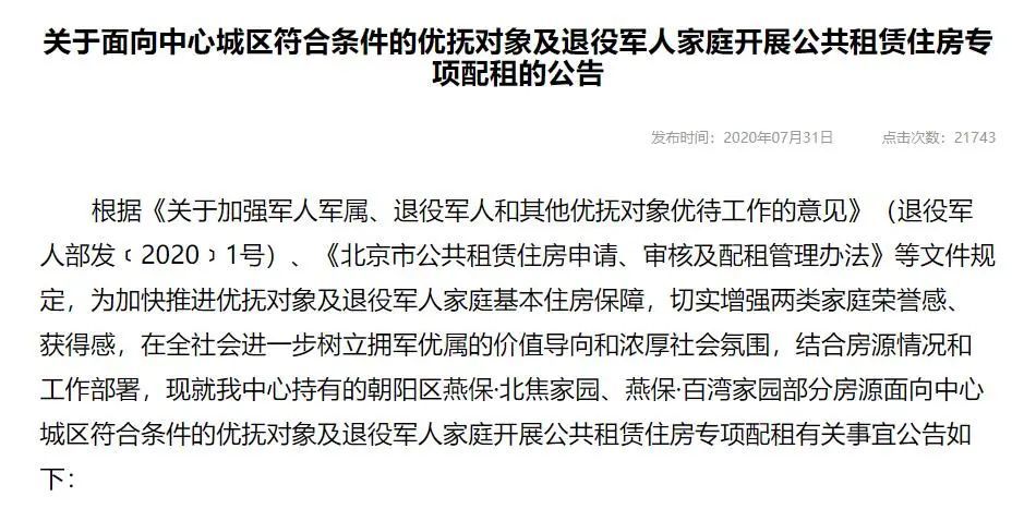老班长注意到,去年北京市就曾出台面向符合条件的优抚对象及退役军人家庭的专项配租政策。
