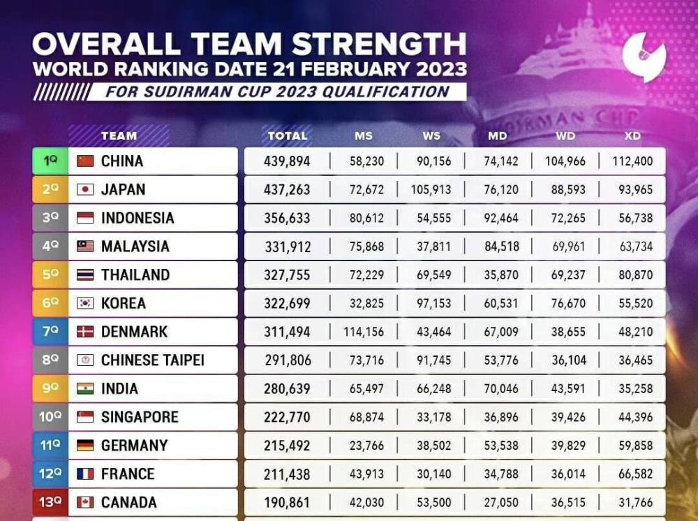 2023年苏迪曼杯已经在苏州圆满落幕。中国队、韩国队分获冠亚军,马来西亚队和日本队并列第三。22日,世界羽联官网随即公布了各单项最新一期的世界排名。中国队的郑思维和黄雅琼、陈清晨和贾一凡继续分别占据混双、女双世界第一宝座,与此同时,男单、男双和女双等选手的世界排名再次来到历史新高。在苏迪曼杯取得5战全胜战绩的石宇奇,世界排名上升至第七位。