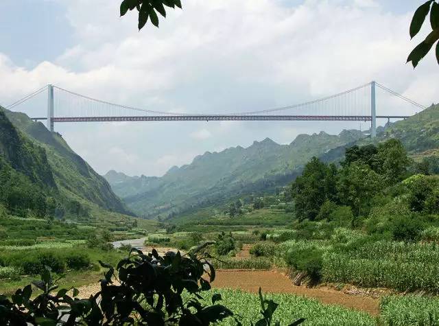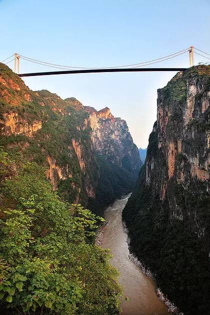 坝陵河大桥:从桥面到谷底水面高度370米高,坝陵河大桥是中国第二高、世界公路桥第三高的悬索桥。坝陵河大桥的唯一之处在于拥有着这些桥梁中最大跨度1088米——几乎是和金门大桥一样长!