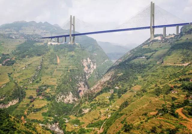 贵州北盘江特大桥:距离水面高度565米,跨度720米,第一个突破桥梁高度500米的障碍,并首次成为拥有“世界最高桥梁”头衔的斜拉桥。
