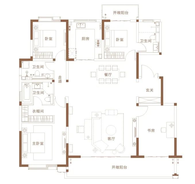 同样能带来开阔感的,还有9.7米的南向超长阳台,横跨宽厅和书房两个房间,让光线从各个方向涌入室内。