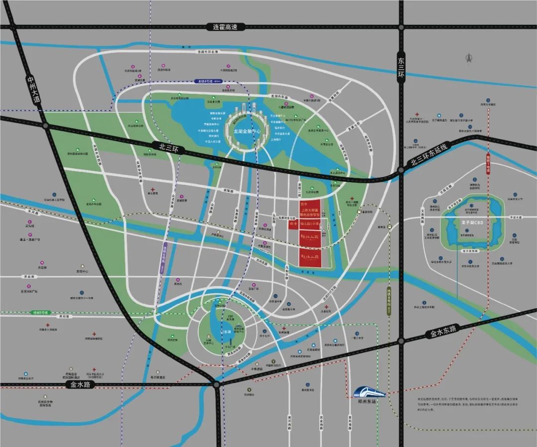 它的南边是东风渠和河畔公园,东边是创新创业综合体金融智谷北龙湖,郑大一附院与它隔着运河,直线距离大约1公里,不远不近刚刚好。